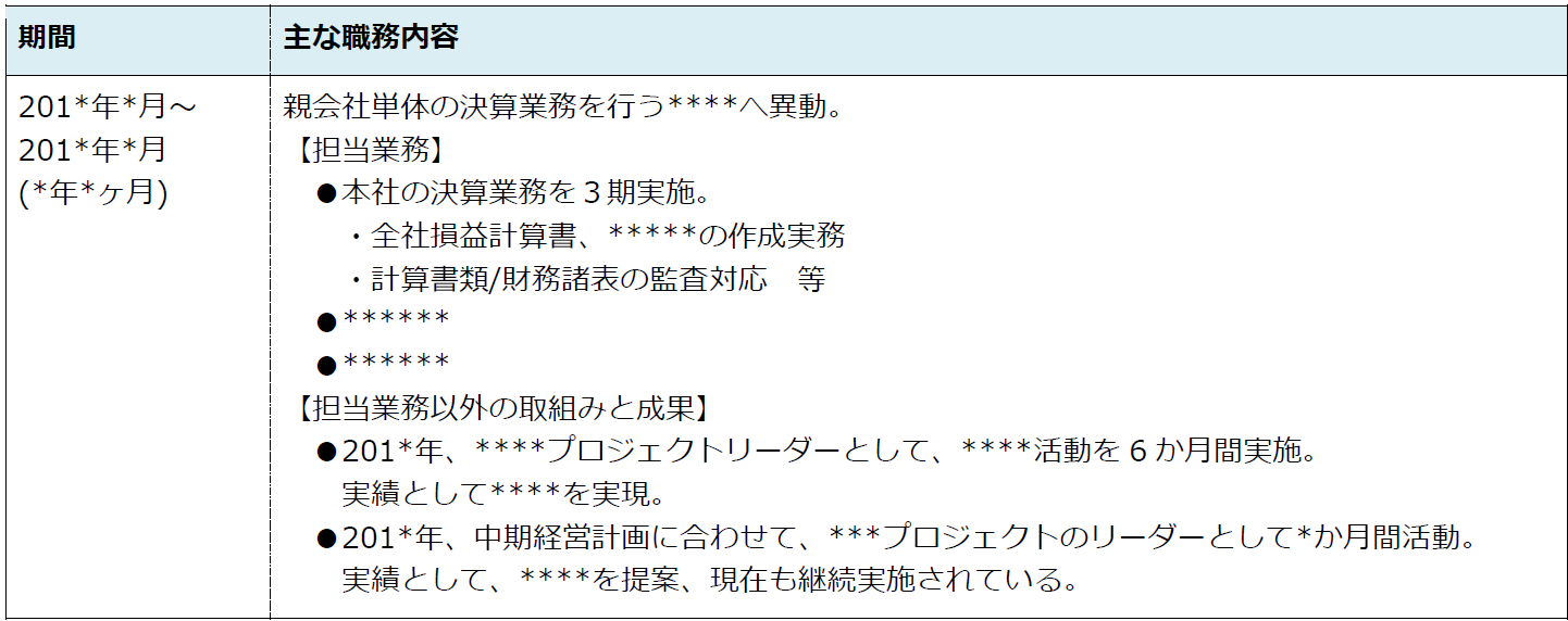 私の場合は、上段に位置する自己PRに大きく関係する経理職歴は手厚く記載、それ以外の職歴はやったことをあっさりと記載しました。